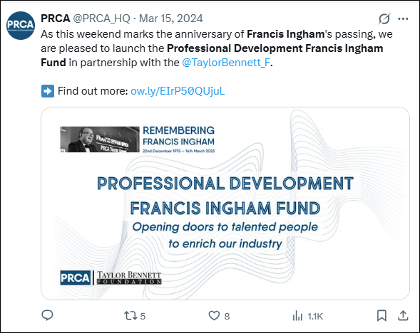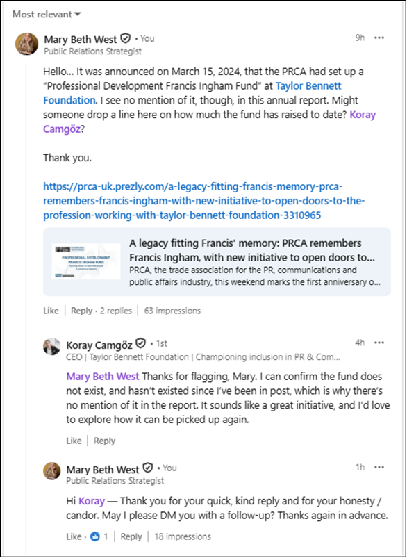 I typed a question into the PRCA’s LinkedIn feed, asking both the PRCA and Taylor Bennett Foundation if there was an update on the status of the fund. I presumed data about the “Professional Development Francis Ingham Fund” giving total raised to date were simply aggregated elsewhere within the report.