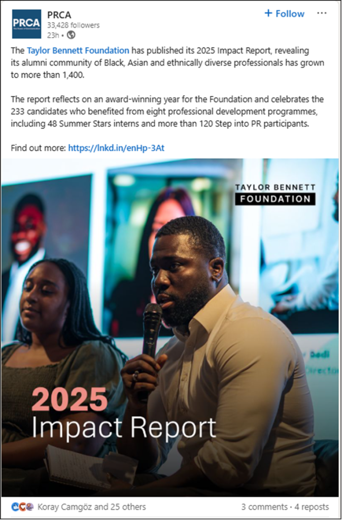 The PRCA re-posted on LinkedIn on December 11, 2025, the Taylor Bennett Foundation’s “2025 Impact Report.”