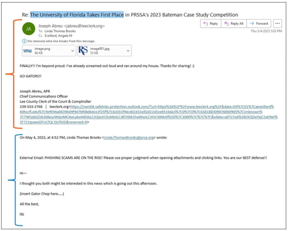 The following year, Linda dutifully gave advance / preferred notice to Joseph Abreu (using his government e-mail address) and Abreu’s fellow Gator on PRSA’s Board, Angela Eveillard, of their alma mater’s prestigious PRSSA Bateman Competition win (e-mail below).