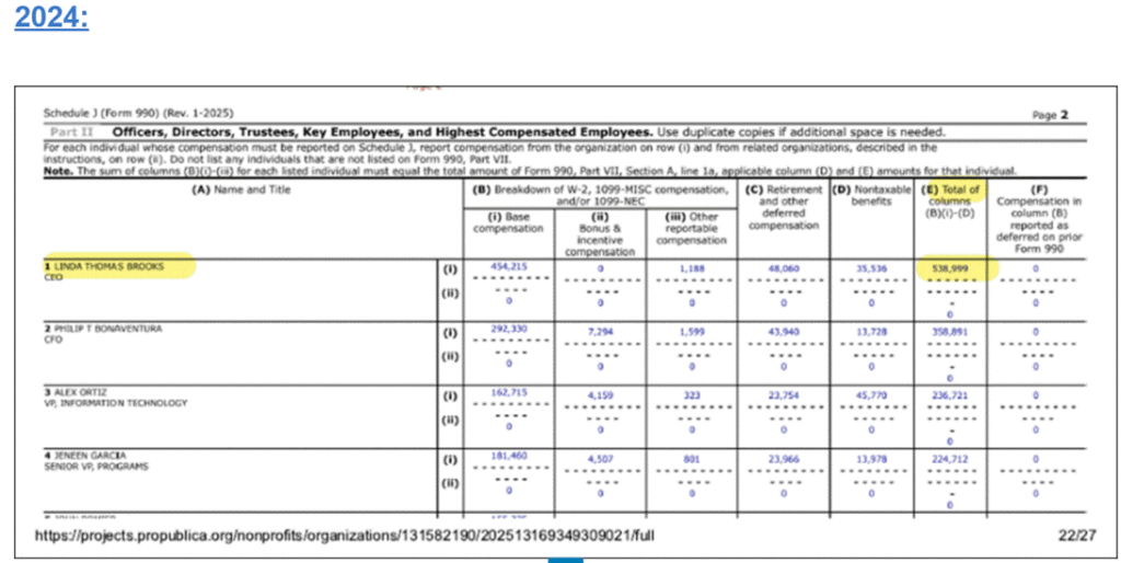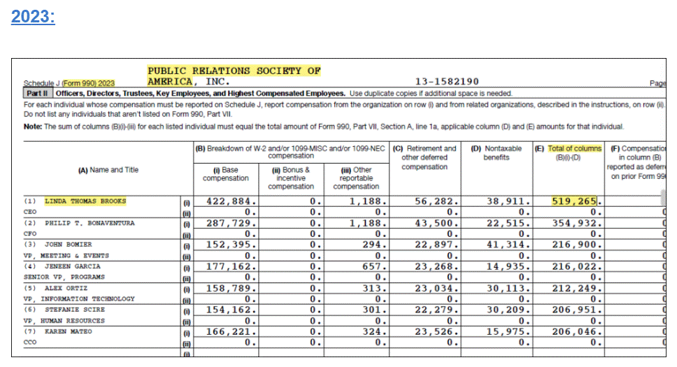 Later, according to PRSA’s IRS 990 filings, Linda promptly scored a $19,734 comp increase in 2024 over the prior year, under PRSA’s national chairmanship control by “Gator” Joseph Abreu.
