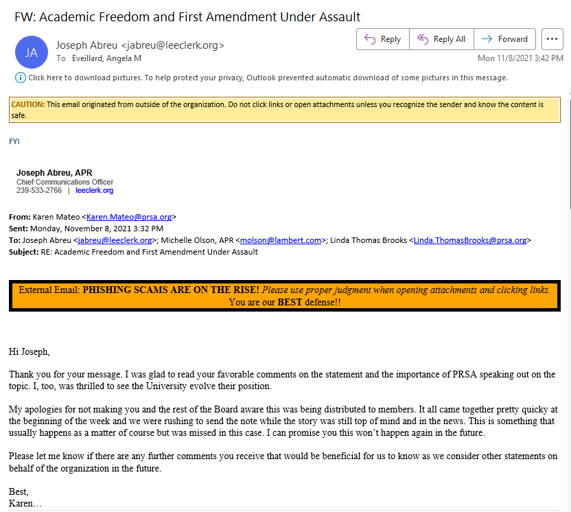 For example, in November 2021, while Mr. Abreu served as PRSA National Secretary, he scolded PRSA staff (including then-CEO Linda Thomas Brooks and PRSA’s Chief Comms Officer Karen Mateo) for not keeping him “clued in” on PRSA advocacy messages tied to partisan political issues in Florida and specifically pertaining to the University of Florida, his alma mater.
