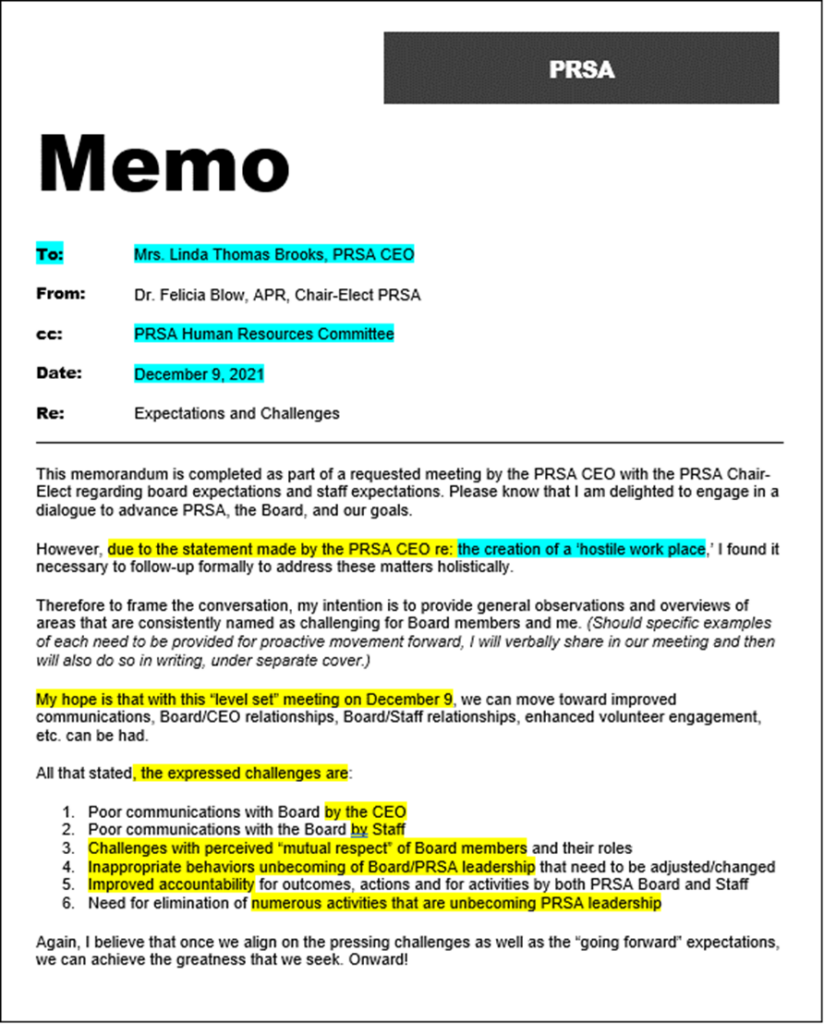 Then, within only days (December 9, 2021) a PRSA memo — legally obtained through FOIA — was exchanged between PRSA National Chair-Elect Dr. Felicia Blow and CEO Linda Thomas Brooks, with documentation of “unbecoming” PRSA Board member behaviors alleged, as well as “inappropriate behaviors” underlying PRSA’s “hostile work place.”