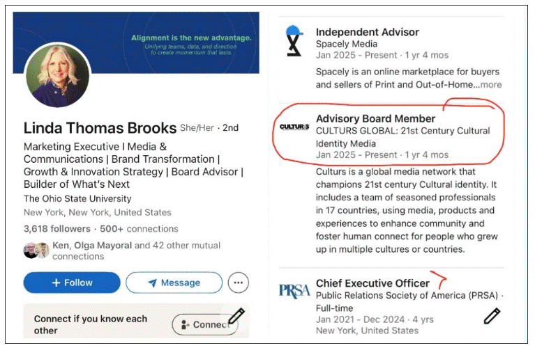 How is it that after Linda left PRSA in December 2024, she suddenly ended up on Culturs’ “advisory board” in what appears to be a paid post (at least as it appears on her LinkedIn page)?