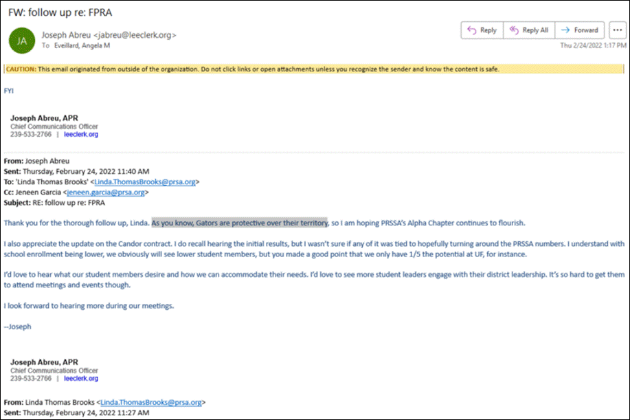 As per my e-mail of concern to PRSA HQ, it was discovered in a legally obtained e-mail that Mr. Abreu had pre-advised (warned?) PRSA’s CEO directly, back in February 2022, that “Gators are protective over their territory.’