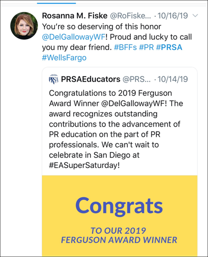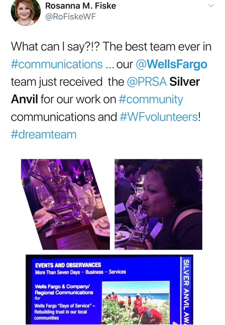 …who also is a UF Gator + PRSA Past National Chair, and also formerly employed with Wells Fargo, and also was appointed to the ACEJMC, and also later received a PRSA Gold Anvil herself…