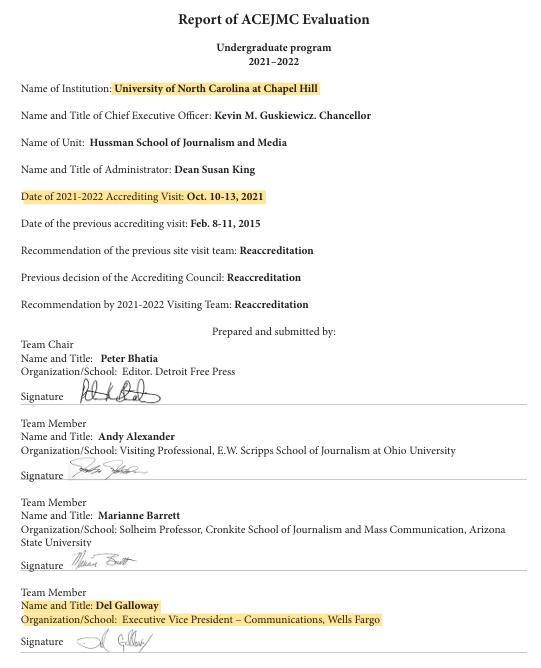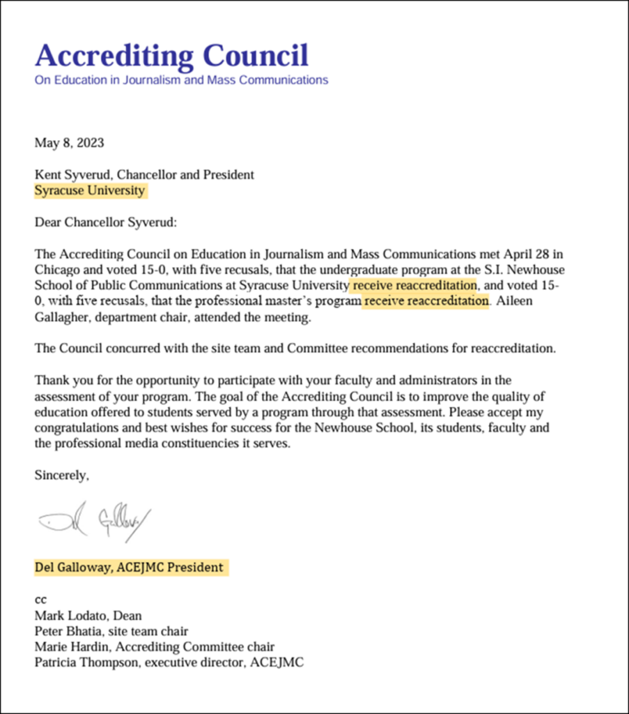 Galloway signed the letter himself for ACEJMC reaccreditation of Syracuse’s PR program employing Tony D’Angelo.
