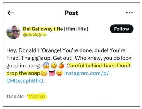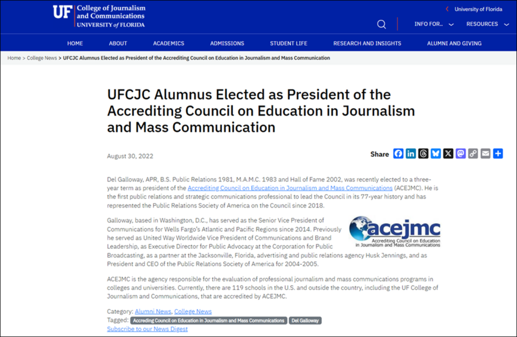 Prior to Galloway’s “favor” given to his good ol’ Gator Nation alma mater, UF posted profusive gushing about Del Galloway’s new ACEJMC role in 2022 on UF’s College of Journalism and Communication website — the very academic program that Galloway’s ACEJMC was pre-scheduled to be reevaluating in 2024-25.