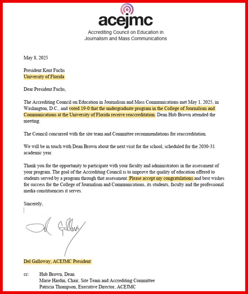 Turns out, UF’s own accreditation review was also upcoming. So why not stack the ACEJMC deck even further?