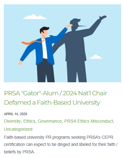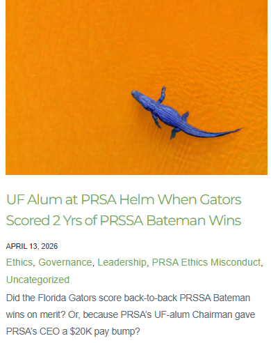 Disclaimer: Only certain people are PRSA cartel members. Many people affiliated with UF and Syracuse are good, honest people, who would be appalled to have known the content and scale of ethics violations going on in PRSA, had the misconduct not been so well-concealed and hidden under PRSA’s rug by certain Syracuse / Gator devotees.