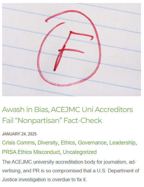 Meanwhile, other university academic program competitors — like the legendary and Hearst Prize-award-winning journalism school at University of North Carolina-Chapel Hill — were placed on “provisional” / or downgraded status by Galloway / ACEJMC, on DEI grounds, with sham findings that UNC failed to comport with Galloway’s and PRSA’s (and Omnicom’s and Joe Biden’s) own like-minded, left-wing partisan ideals of DEI dogma.