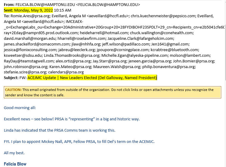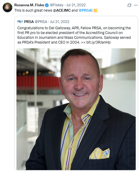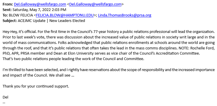 During that interim timeframe, Galloway clawed his way up the ACEJMC political pecking order, to become the President of the ACEJMC himself, in 2022, which Galloway relayed in a “Hey-Hey” e-mail to then-PRSA Chair Dr. Felicia Blow, in this legally obtained doc (FOIA):