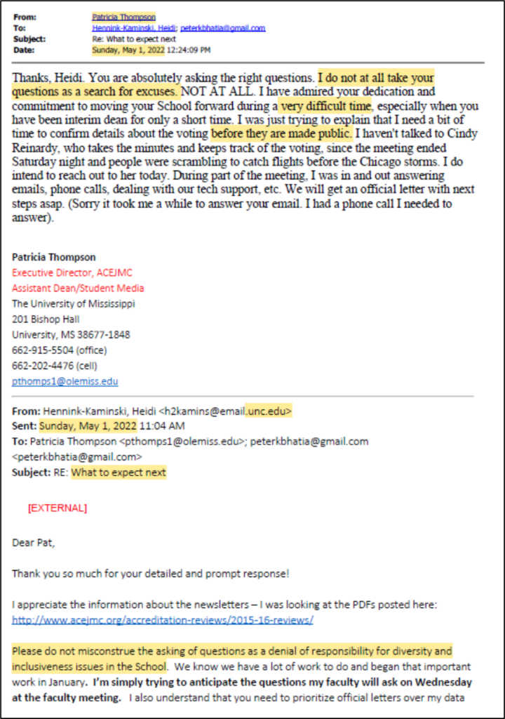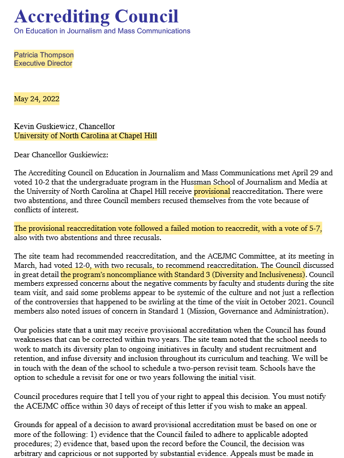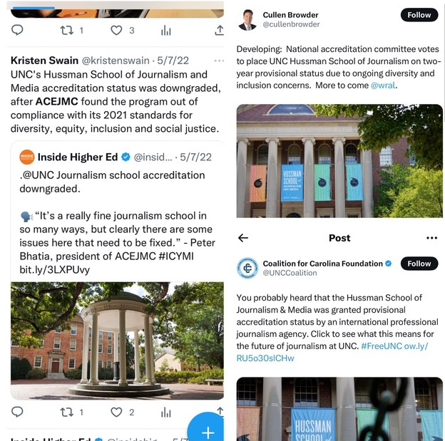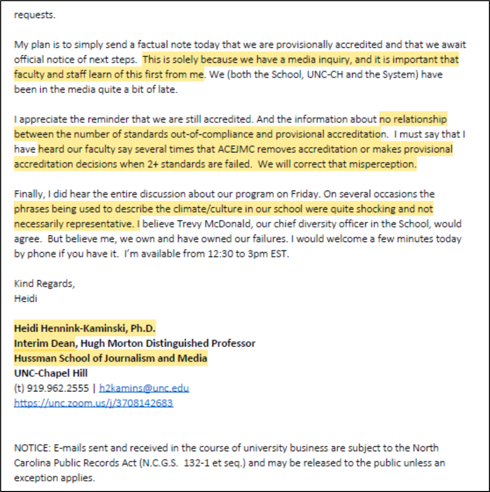 Public-domain e-mails clearly show UNC-Chapel Hill already was receiving media inquiries about the downgrade BEFORE UNC staff was given the formal letter by ACEJMC officials, telling UNC they were downgraded and the reasons for it (DEI).