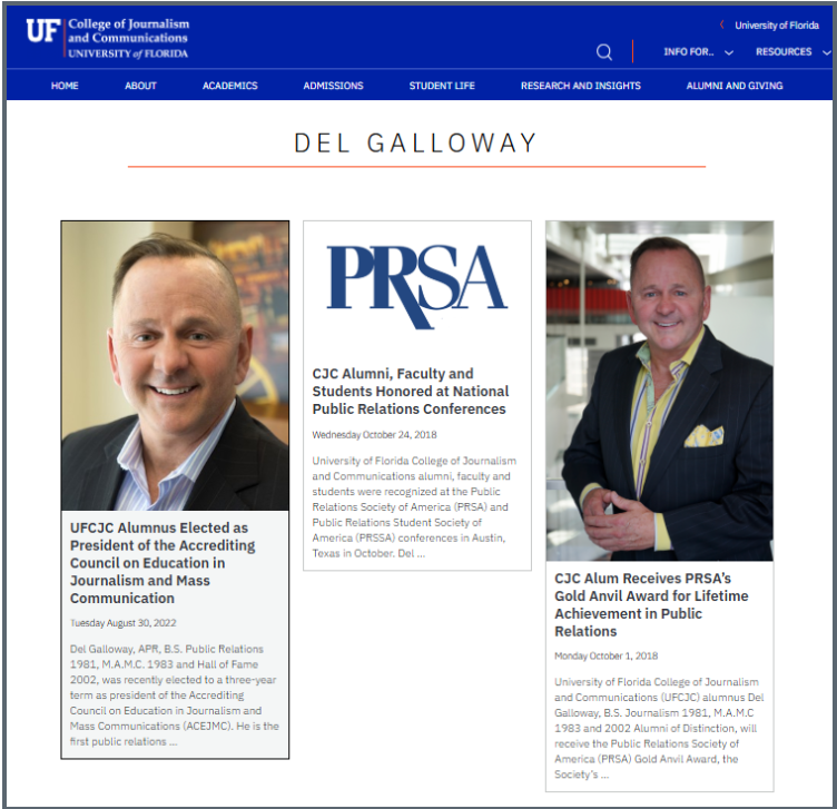 Gator Land even gave Galloway his own designated / tagged web page on UF’s website, as an “altar” of sorts, for Del Galloway + PRSA publicity, praise and general egomaniacal sucking-up: