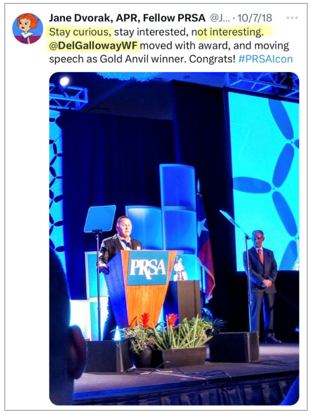 A few months after D’Angelo’s lying fiasco occurred (with no accountabilty for D’Angelo), D’Angelo decided that his chairmanship year of 2018 would be a super-duper time to induct Del Galloway (of University of Florida alumni status) as a PRSA “Gold Anvil” Award honoree.