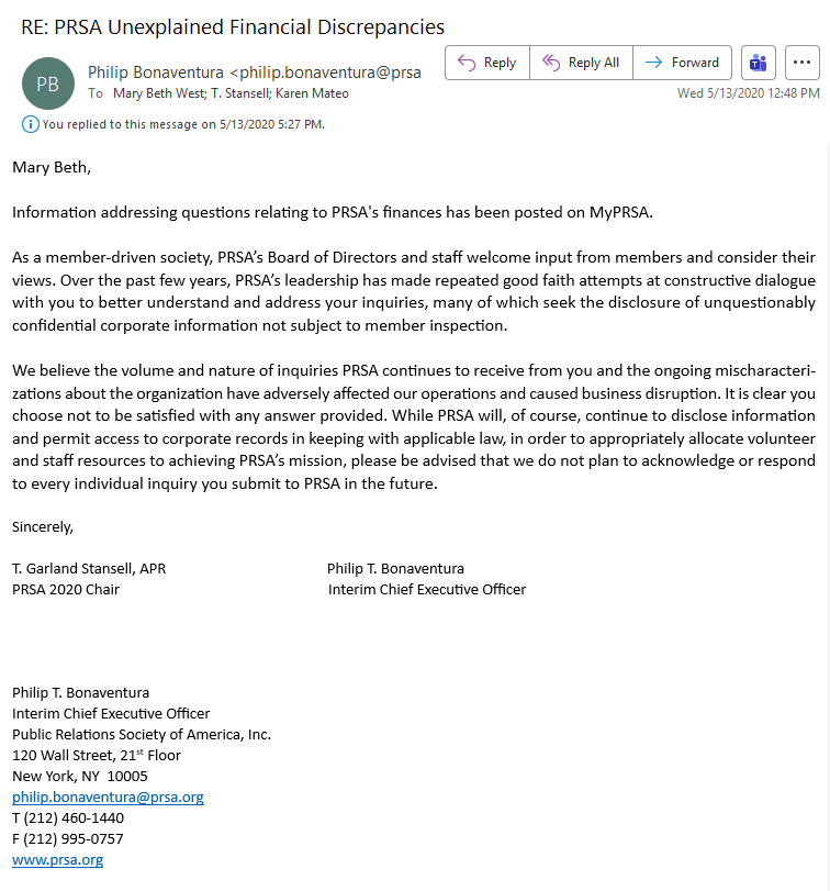 Or, like when two guys whom I only found out years later are Syracuse University grads in PRSA (who just happened also to be the 1) PRSA Foundation President and the 2) PRSA CFO) scolded me for asking too many PRSA / PRSA Foundation financial-discrepancy questions, and told me they no longer would answer questions, in a very hostile, accusatory, and bullying / misogynistic fashion: