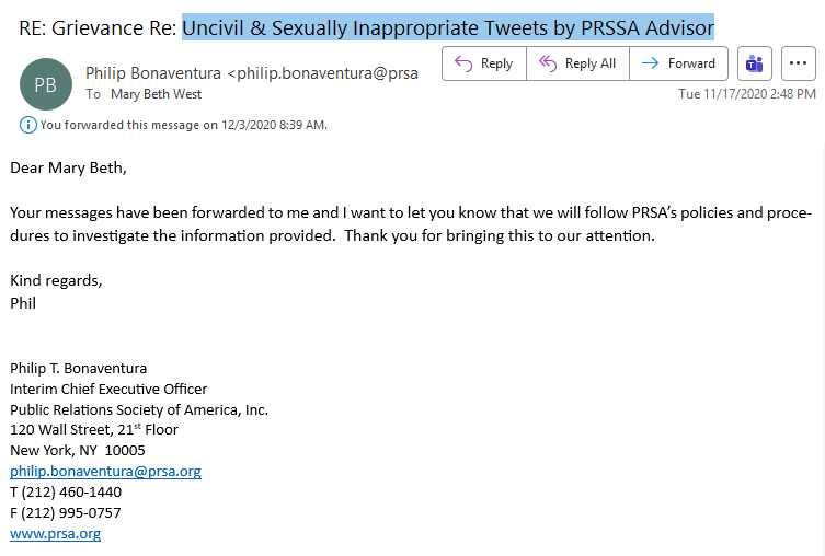 Naturally, this overt lying to media and to members by a sitting PRSA National Chair should have resulted in Anthony D’Angelo of Syracuse University being booted off the PRSA National Board and kicked to the curb from PRSA’s membership for gross ethics violations.