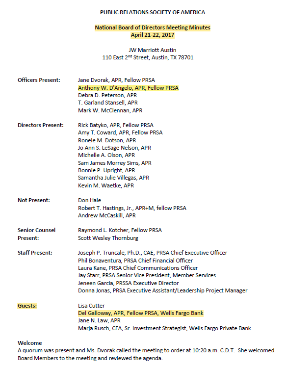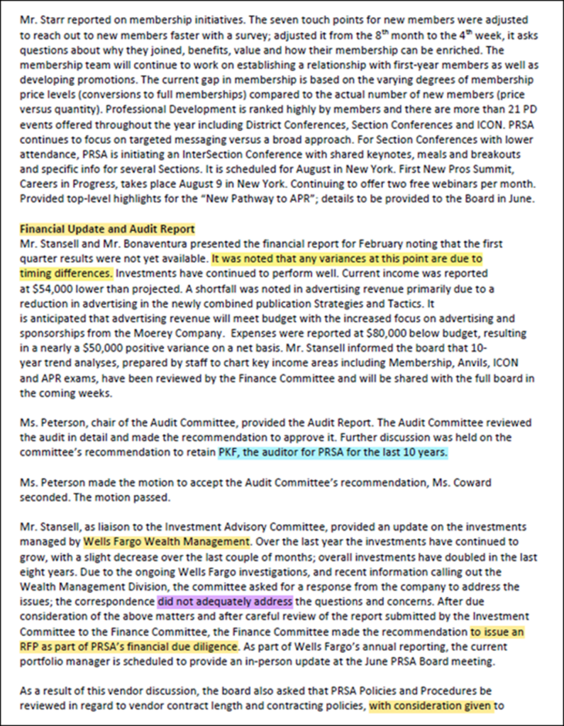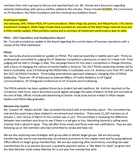 After all, D’Angelo was marked as “Present” at the 2017 PRSA Board meeting when Galloway helped present the Wells Fargo investment portfolio review to the entire PRSA Board.
