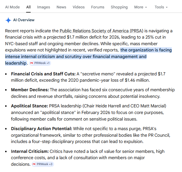 As such, the people in charge of enforcing PRSA’s rules are often the worst rule-breakers themselves. For example, in 2026, PRSA’s Jane Dvorak, who has a long, painful history of ethics violations herself (many are mentioned in my other blog posts), was made “Grievance Chair” of PRSA.