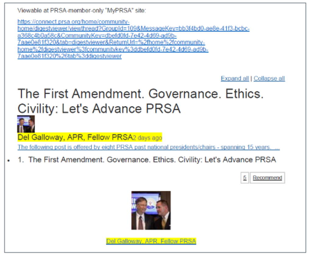 After all, Del Galloway had rushed to D’Angelo’s aid that year, posting on the MyPRSA online member message board a full-throated endorsement of D’Angelo and other PRSA leadership ethics violators.