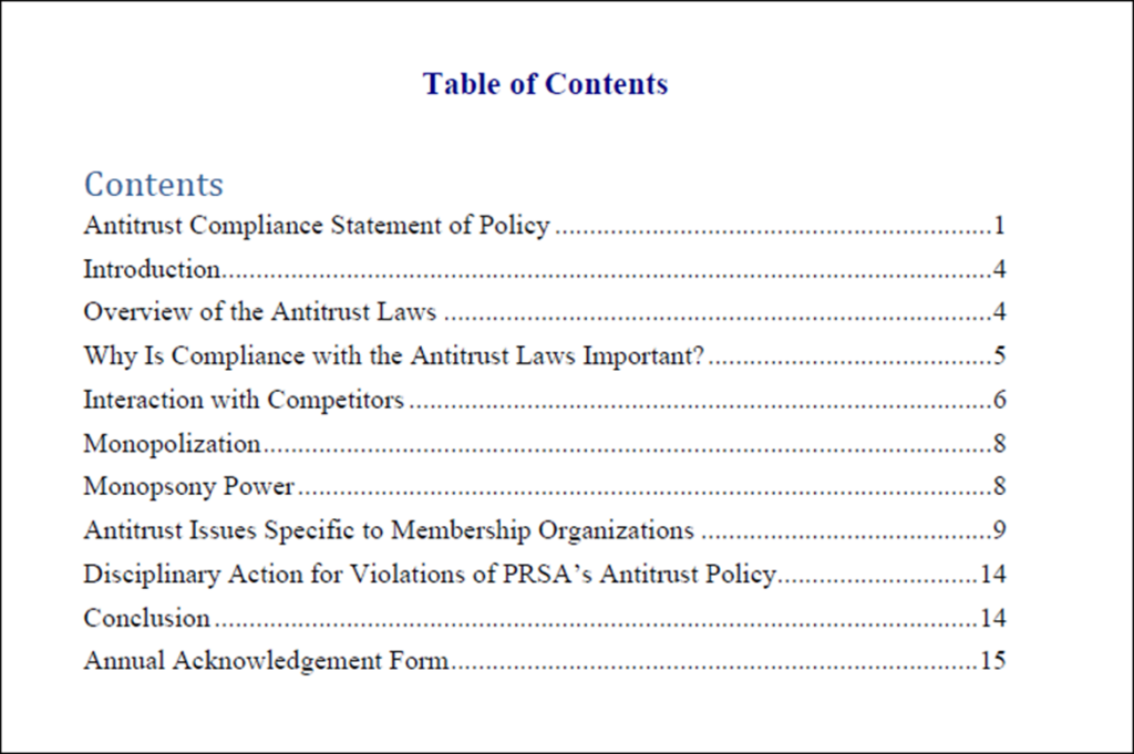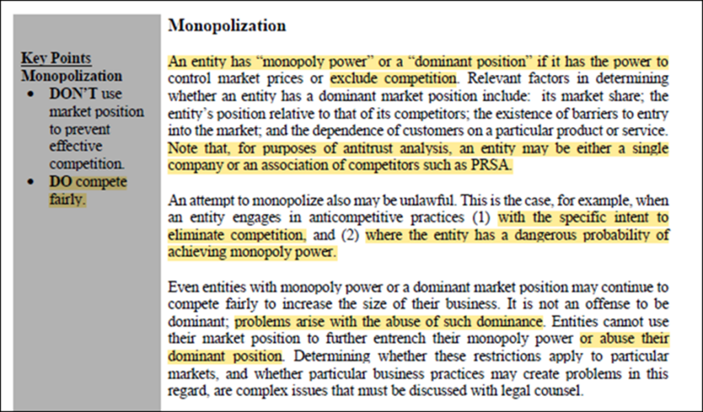 - NOTE: PRSA Antitrust Policies have clearly stated that compliance with antitrust rules falls back on individual members, which potentially implies that PRSA may leverage this stipulation as a rationale not to indemnify or pay for volunteer board member legal liability that could result from a federally prosecuted antitrust settlement / legal award.
