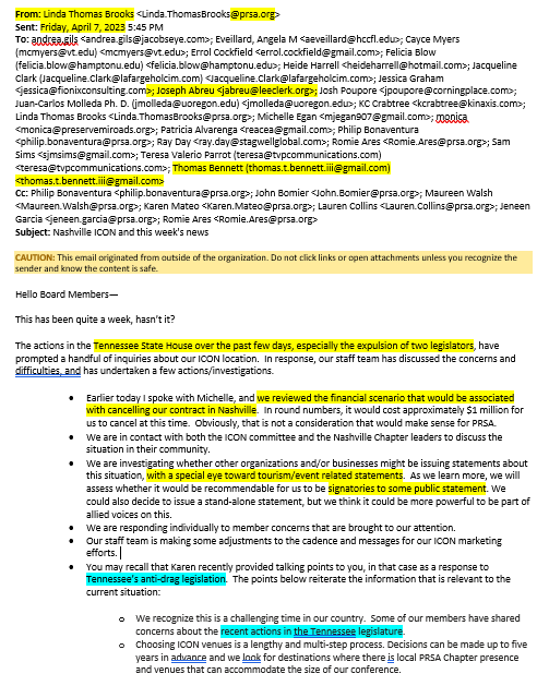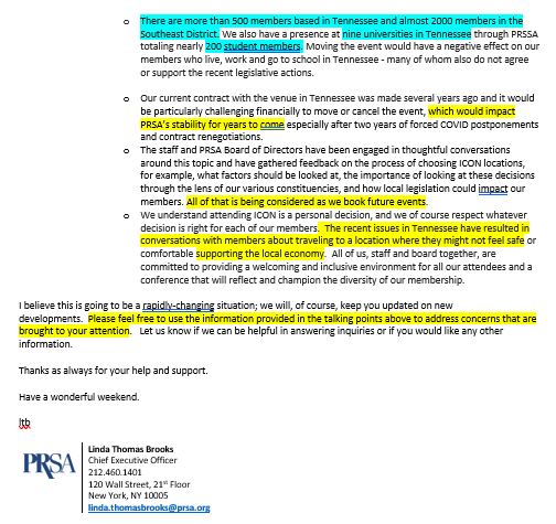 The e-mail from PRSA’s then-CEO, Linda Thomas Brooks, to the full PRSA National Board — dated April 7, 2023 — documents conspiratorial discussion and scheming among top PRSA staff and National Board leadership to cancel PRSA’s contract to hold its 2023 PRSA International Conference, known as PRSA ICON, in Nashville, as was scheduled later that autumn.