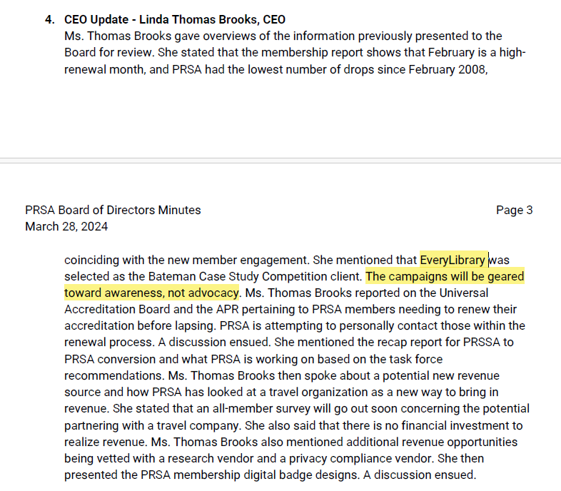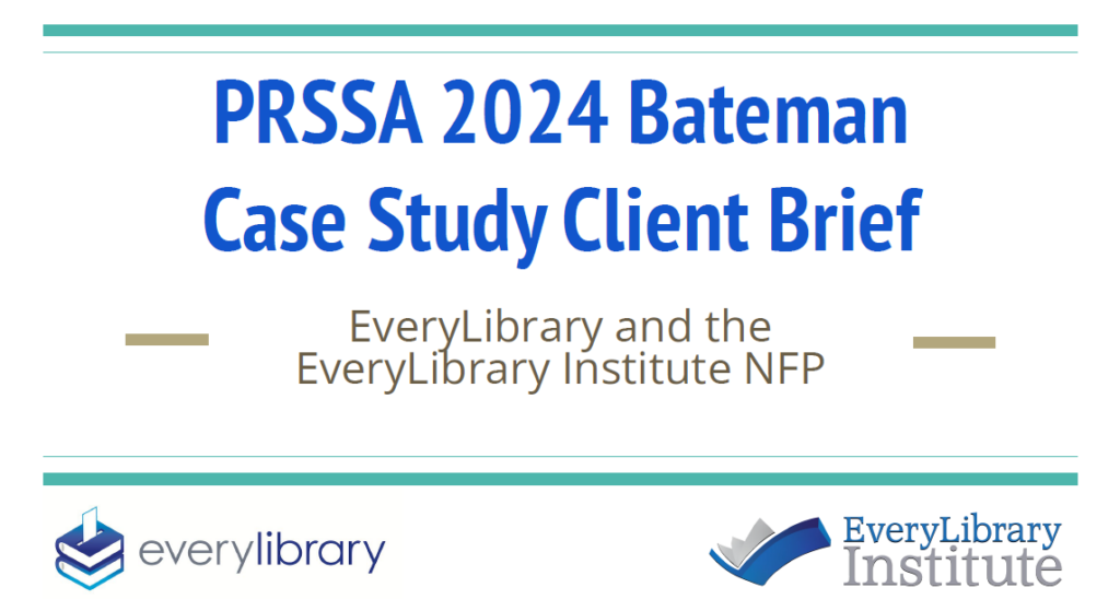 PRSA CEO Linda Thomas Brooks was behind the choice of EveryLibrary as PRSA’s Bateman Competition “client,” which procured for EveryLibrary’s use PRSSA students nationwide as unpaid / uncompensated student PR labor.