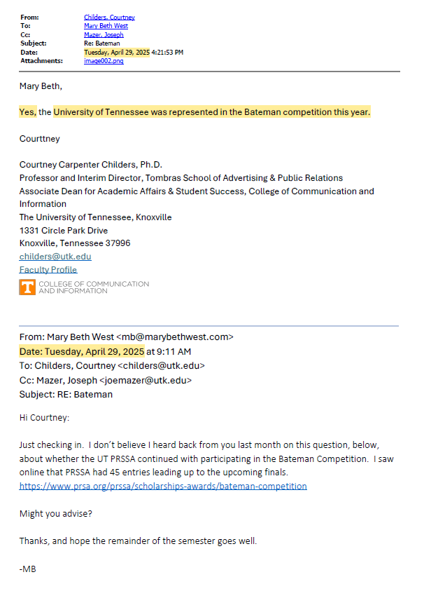 In 2026, a University of Tennessee-Knoxville PR program faculty member is listed on PRSA’s website as a PRSA committee chair, as is a Lebanon, Tennessee-based PR executive with the National 4-H Council.