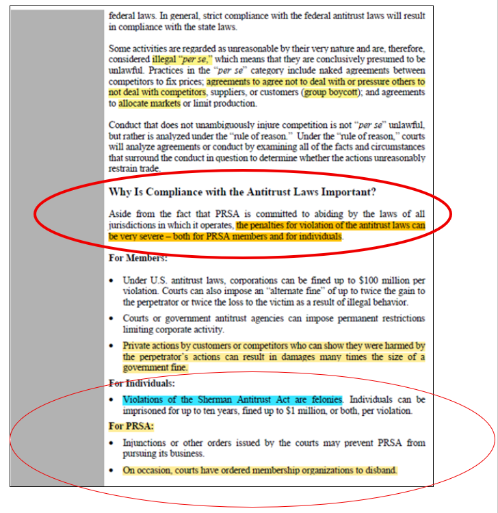PRSA officials are fully knowledgeable that antitrust violations risk PRSA’s corporate charter, and, that leadership offenders could be fined and/or sentenced to jail time.