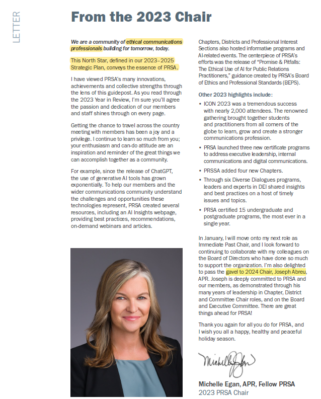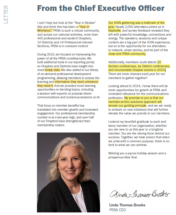 Later, at year-end 2023, CEO Linda Thomas Brooks lauded the Nashville conference in PRSA’s 2023 annual report as “a hallmark of the year,” without disclosing the earlier desired boycott in April.