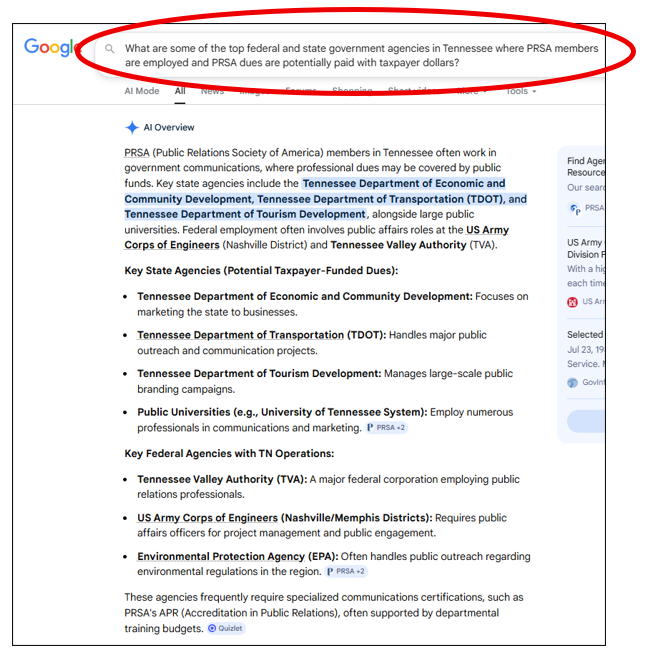 PRSA operates five membership chapters in Tennessee (Chattanooga, Knoxville, Memphis, Nashville, and Tri-Cities), with “more than 500 members based in Tennessee,” according to Thomas Brooks’ 2023 e-mail to her Board, as well as PRSA’s “presence at nine universities in Tennessee through PRSSA totaling nearly 200 student members.” Many PRSA members are government- and university-employed: