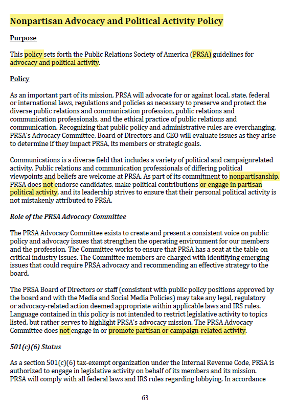 In violation of PRSA’s own “Nonpartisan” and “Antitrust” policies (which widely are concealed from rank-and-file member view so that Board leaders are not held accountable for violations), PRSA pushes partisanship and cartel-driven agendas routinely — with a long, documented track record.