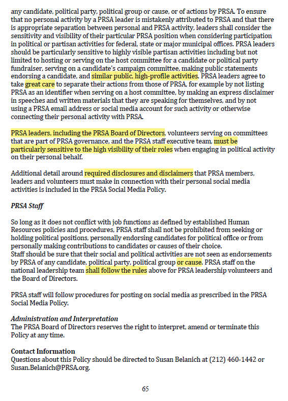 PRSA seeks to force its left-wing ideology and partisan views on U.S. citizens, via the PR industry, and to exact retaliation / consequences against PR industry practitioners and businesses who reject views not to PRSA’s liking.