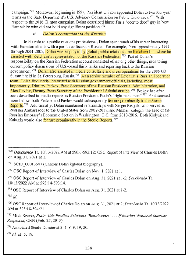 By contrast, Charles Dolan[13] (a.k.a “Chuck” or “Chas”) – a former Ketchum senior executive and later subcontractor[14] for Ketchum’s Russian Federation PR account[15] during those years[16] – was mentioned in the Durham Report a whopping 472 times (including DOJ source footnotes).