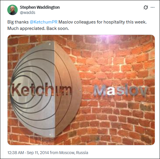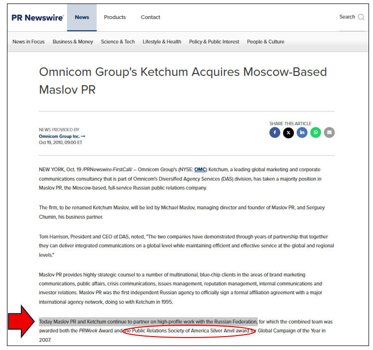 - The Omnicom-owned[38] “Ketchum Maslov”[39] Moscow-based PR firm acquisition in 2010 by Ketchum. This Omnicom sister firm for Ketchum in Russia enabled the New York-based Ketchum[40] to hand off all kinds of dealings[41] while keeping profits under Omnicom’s holdings, once it became abundantly inconvenient for Ketchum’s operations on U.S. terra firma to register those pesky, publicly discoverable foreign-agent disclosures with the DOJ.