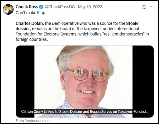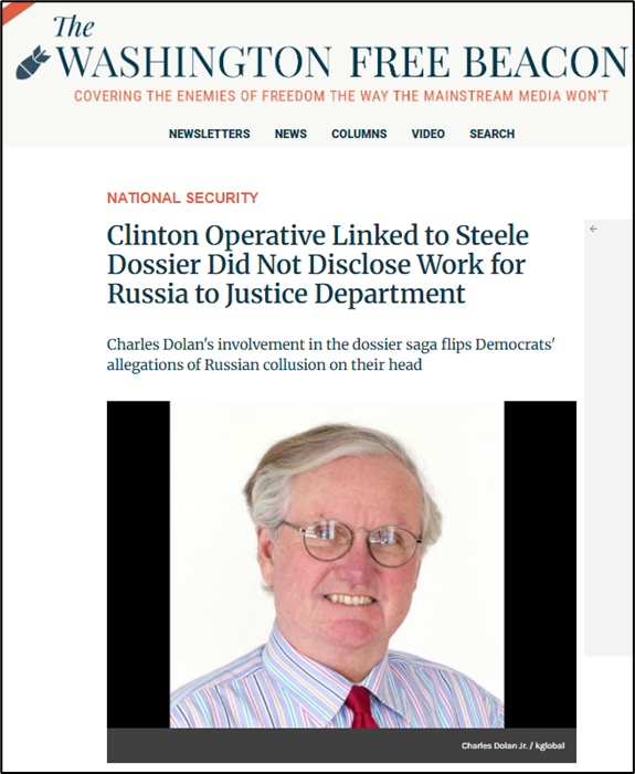 Notably, the report exposed Mr. Dolan’s Clinton campaign links to Steele Dossier mythology[21], like the salacious and depraved urination-video rumor[22], falsely alleging videotaped goings-on, so to speak, in a Moscow hotel room.