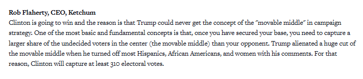 PRWeek included then-Ketchum CEO Rob Flaherty in the group gush-fest, stating: “…Clinton will capture at least 310 electoral votes.”