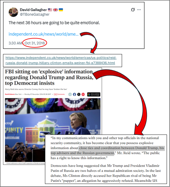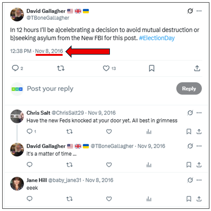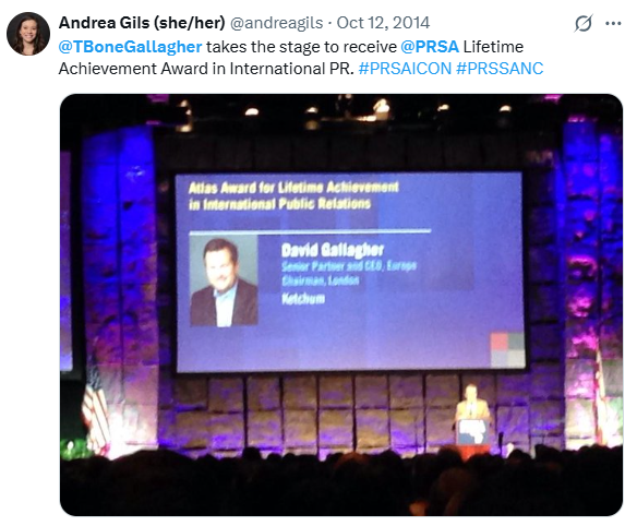 For his part, a prominent prior Ketchum Europe CEO and then-Omnicom President of “Growth and Development International,” David Gallagher (a London-based U.S. expat and 2014 winner of PRSA’s “Atlas Award”), chimed in on Twitter / X himself (@tbonegallagher), on October 31, 2016, claiming he was “quite emotional” over the “FBI sitting on ‘explosive’ information regarding Donald Trump and Russia” — per a news article he hyperlinked to in his tweet.