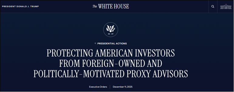 Last month, both proxy firms were separately called out in President Trump’s December 11, 2025, Executive Order, “Protecting American Investors from Foreign-Owned and Politically Motivated Proxy Advisors.”[26]