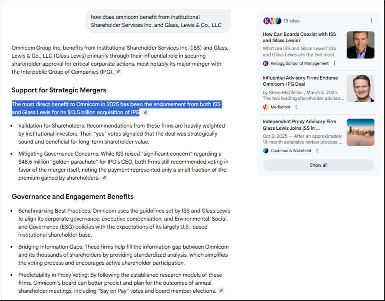 Some 22 months after the May 2023 Durham Report, PRWeek celebrated another headline on March 5, 2025, “Omnicom-IPG deal gains support,”[24] spotlighting that Omnicom’s acquisition of IPG would be endorsed[25] by both Glass, Lewis & Co., LLC, and Institutional Shareholder Services Inc. (ISS).