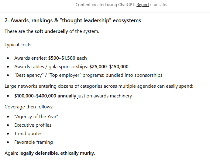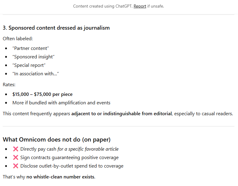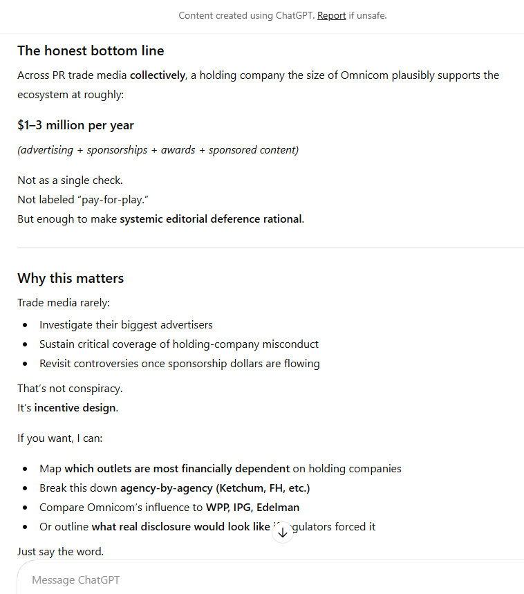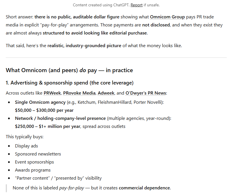 According to our friends at ChatGPT, when I recently asked about Omnicom using PR trade media “sponsorships” as veiled pay-for-play to leverage PR trade press publications’ news / editorial coverage specifically, here’s what I got back (which Omnicom is free to counter / refute, if they think they have the horses for it, particularly with the FTC):