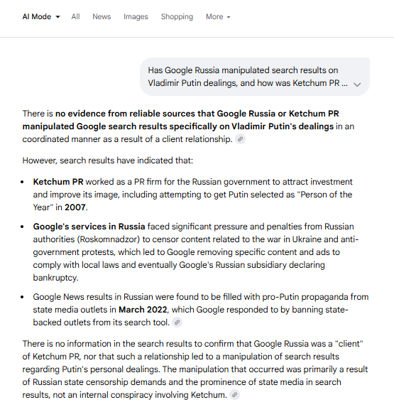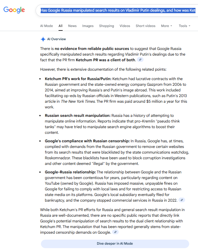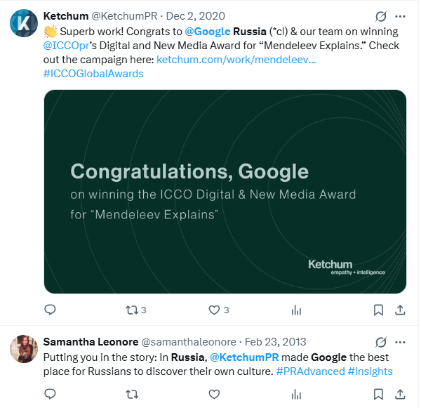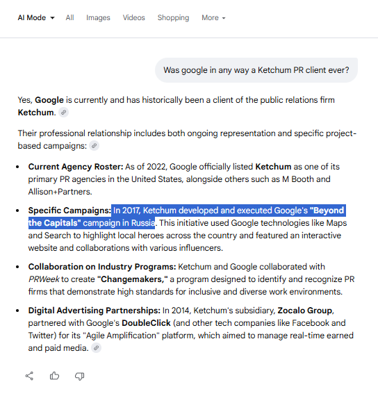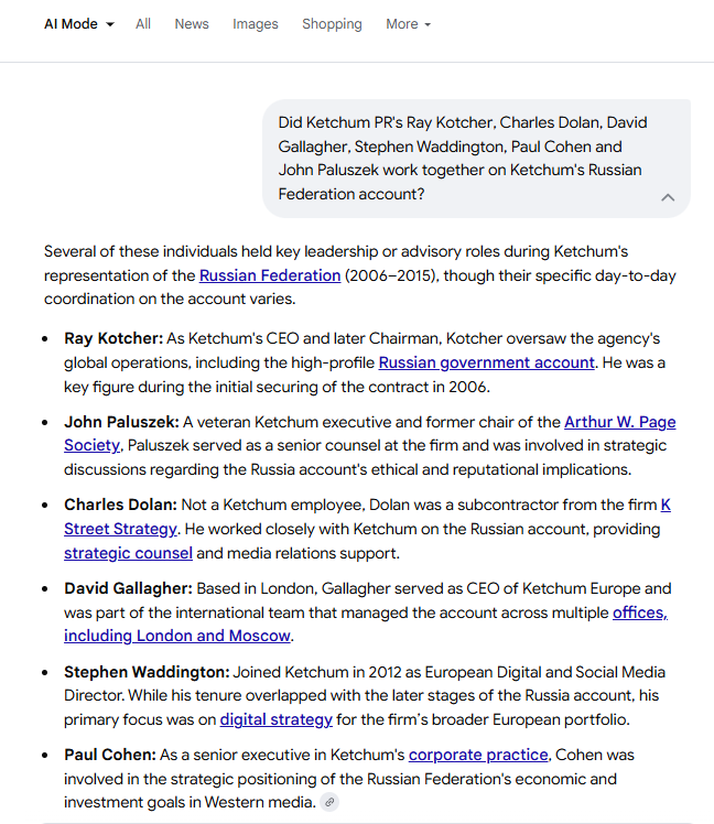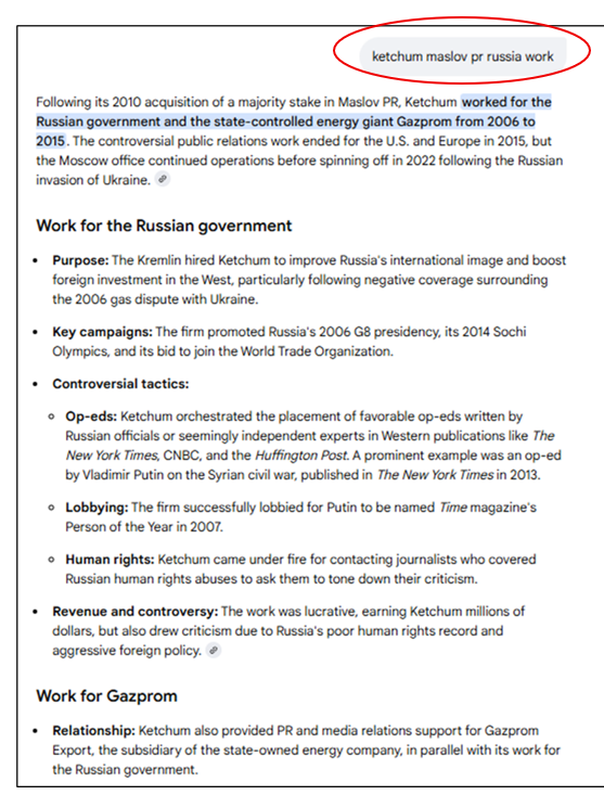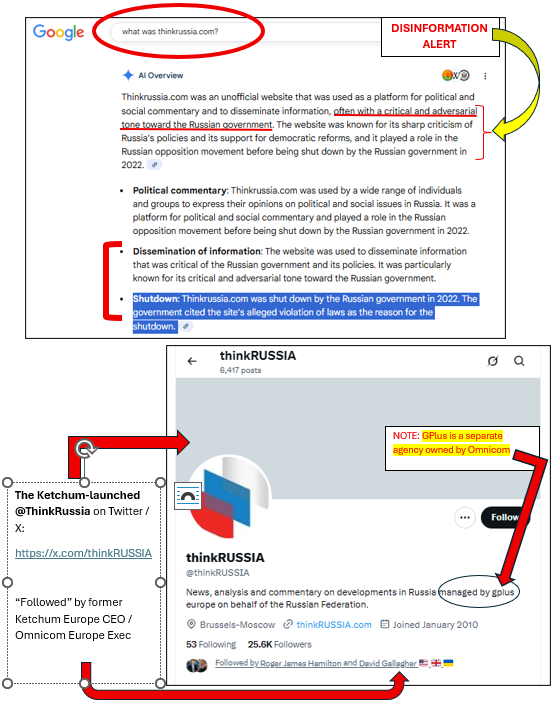 - The Omnicom-owned GPlus[53], a Ketchum subcontractor[54] in Europe[55]. GPlus began handling Ketchum’s post-launch “ThinkRussia” website[56] and @ThinkRussia[57] Twitter (later X) handle[58] set up for pro-Putin propaganda, as noted in Ketchum’s Russian Federation foreign-agent filings with the DOJ. (The website search results were clearly later manipulated to claim Ketchum’s ThinkRussia.com for its client was an “adversarial” website to Russian government interests — a blatant lie.)