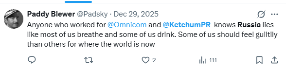 In fact, my research from 2025 still has me black-and-blue, from falling out of my chair on so many subsequent occasions at all of these additional Omnicom-Russia revelations. (My apologies to PRSA and PRCA industry colleagues for whom this stuff is somehow old news or otherwise a total yawner):
