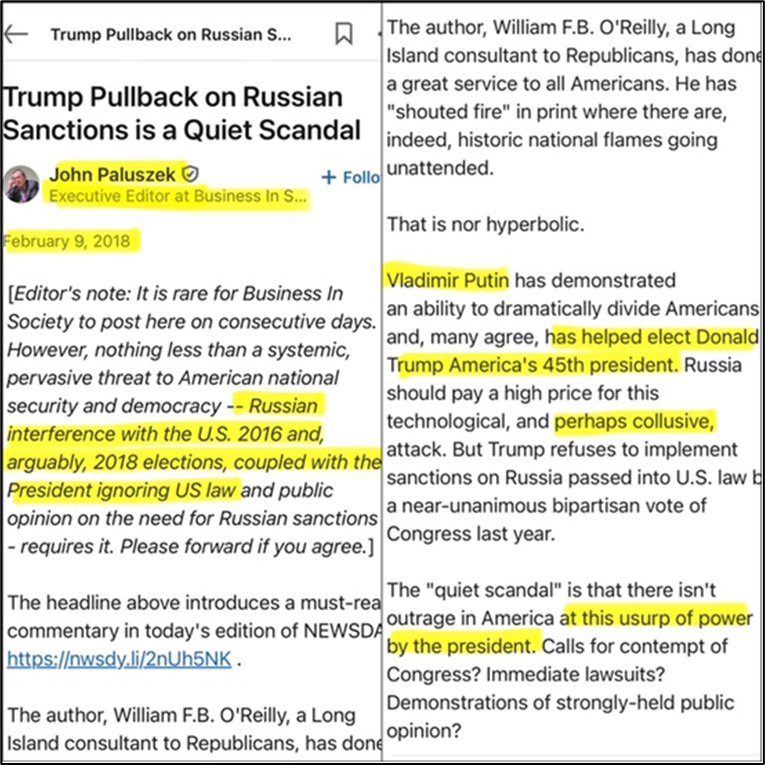 To wit, I practically fell out of my chair reading the Durham Report the first time, when I later realized that multiple colleagues whom I directly know and have interacted with myself in the New York- and London-centric PR association world had their own fingerprints all over Omnicom’s / Ketchum’s Russia dealings – including those directly pertaining to Durham Report findings and/or Mr. Dolan.