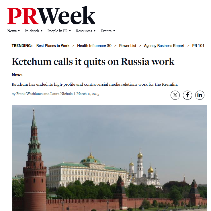 In 2015[63], Ketchum pinky-promised[64] the PR industry that it essentially[65] was done working for Putin’s government, according to a variety of PR industry trade media reports, as well as featured content in The Moscow Times: